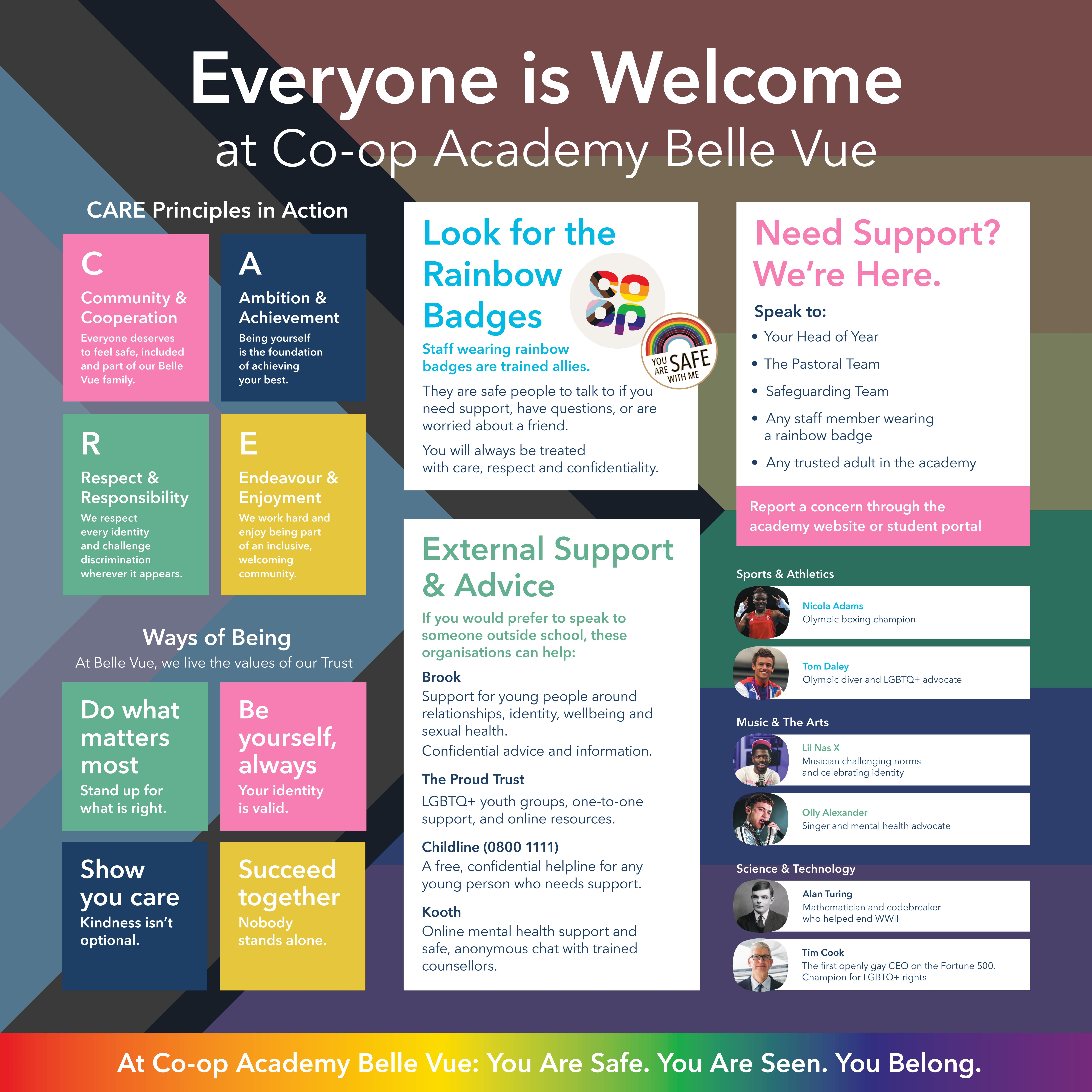 At Co-op Academy Belle Vue, we are committed to creating and maintaining a safe, inclusive and empowering environment for all. We will promote the inclusion of LGBTQ+ students and staff, as well as working to support our families and the wider community to ensure all groups are represented and included at our academy.